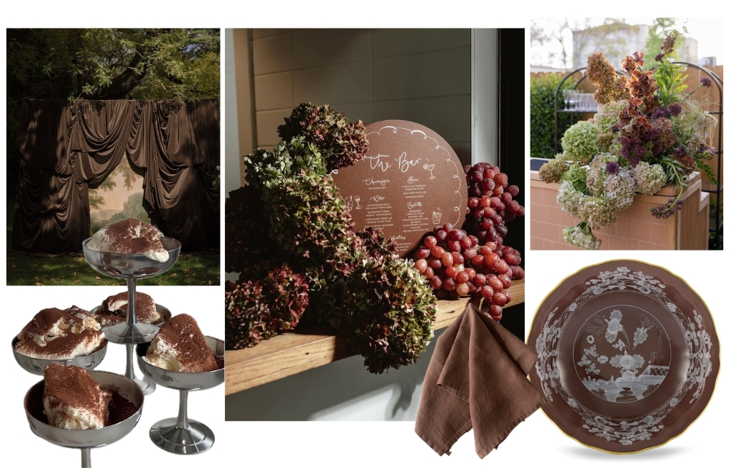 Chocolate brown makes a powerful comeback in 2026 — in fashion, interior design, and of course, in the world of weddings. It brings warmth, depth, and a tactile richness to the celebration: think autumn tablescapes, theatre-like velvets, cocoa tones, and forest sunsets.