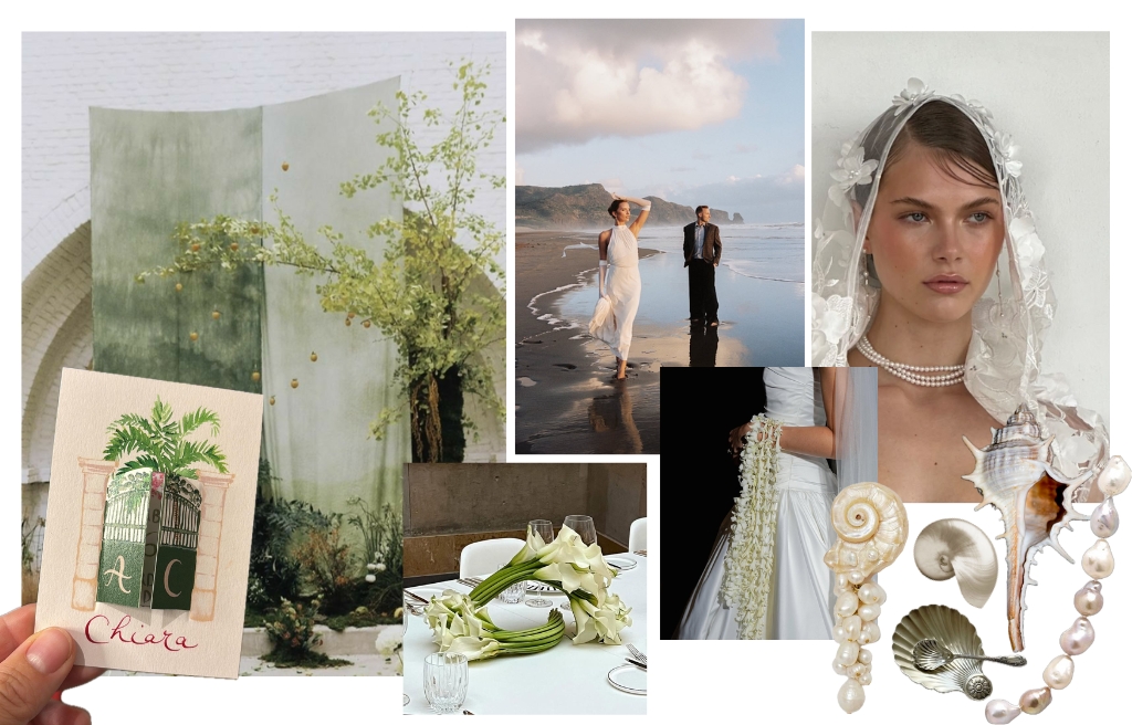 Flowing gowns, embroidered veils, baroque pearls, and centerpieces of calla lilies and pearlescent shells create a poetic, sensual aesthetic. It’s a Pinterest-perfect moodboard that also embraces a more sustainable, “green wedding” vision — a precious minimalism where every detail reflects harmony and grace.