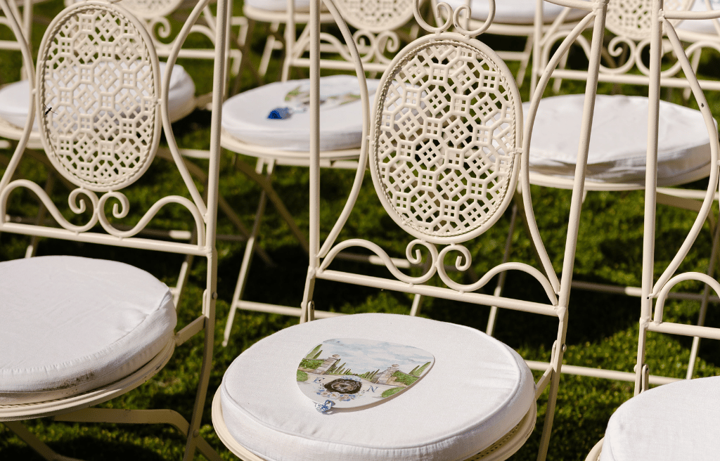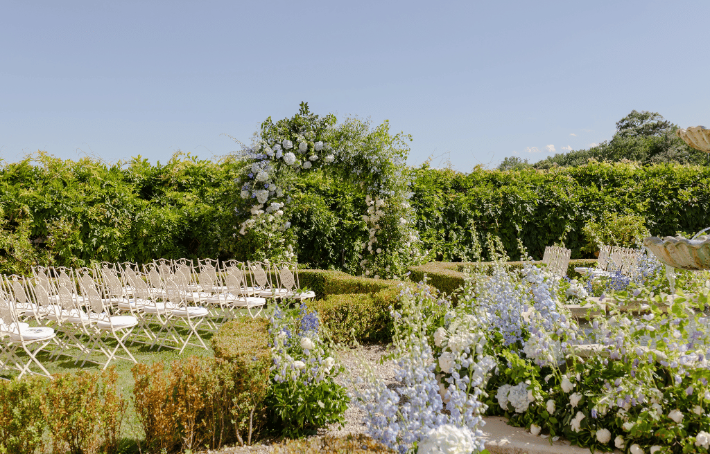 The ceremony took place in the estate’s Italian garden, framed by elegant symmetry and overlooking the medieval borgo that seemed to suspend time itself. Emily and Nat exchanged their vows surrounded by white flowers with soft blue accents, while romantic wrought-iron chairs added a vintage charm. The atmosphere was intimate and moving, accompanied by the hushed emotion of their guests. With sensitivity and discretion, Elisabetta Riccio captured glances and gestures in timeless images, while the team at Waterfall translated words and smiles into a cinematic narrative. Everything unfolded with graceful ease, yet behind every detail lay Blanc Wedding’s invisible artistry, an orchestration that made perfection feel natural.