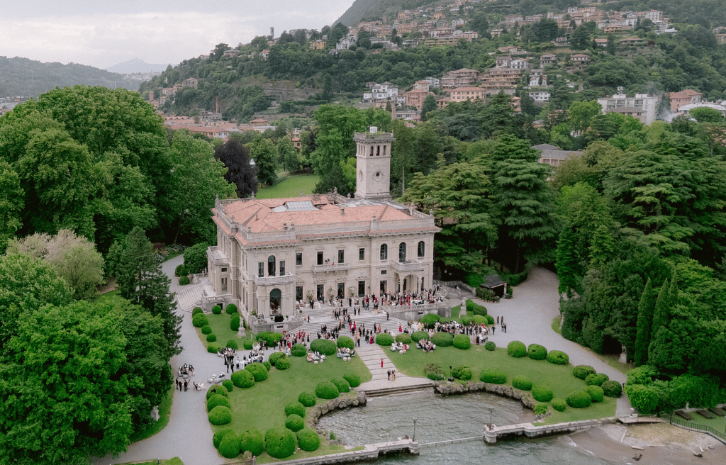 La scelta finale è stata Villa Erba, una dimora storica affacciata direttamente sull’acqua, con saloni monumentali, affreschi e giardini imponenti. La villa non solo rispondeva al loro desiderio di opulenza, ma permetteva anche di accogliere oltre quattrocento invitati, garantendo comfort, fluidità e una scenografia indimenticabile.