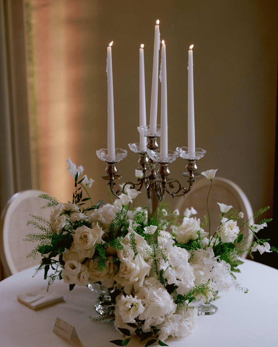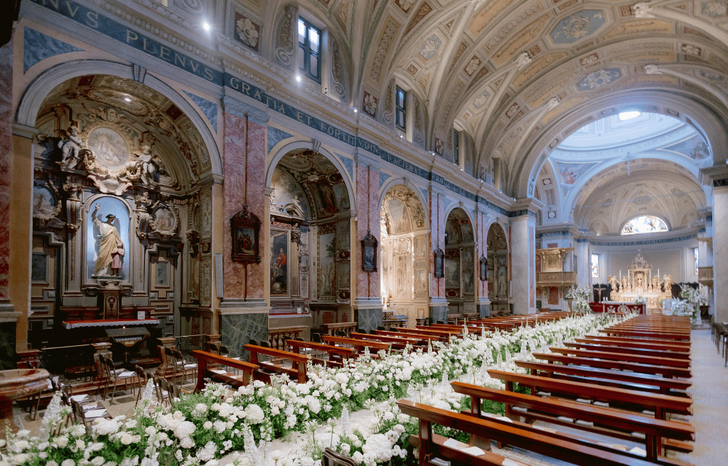 La decorazione floreale, curata da Ratti Flora, ha trasformato la navata in un percorso onirico, dove una pioggia di petali bianchi cadeva dall’alto creando un effetto teatrale e poetico. Tra fiori, affreschi e un’illuminazione disegnata con maestria, la cerimonia ha introdotto l’effetto wow che poi ha caratterizzato tutto il matrimonio. Una fiaba contemporanea dall’atmosfera luxury immortalata di Facibeni Weddings e Waterfallvisuals Videography